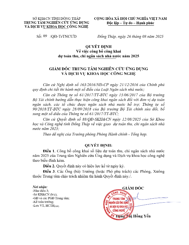 Căn cứ Quyết định số 88/QĐ-SKH&CN ngày 12/08/2025 của Sở Khoa học và Công nghệ tỉnh Đồng Tháp về việc giao dự toán thu, chi ngân sách nhà nước năm 2025.