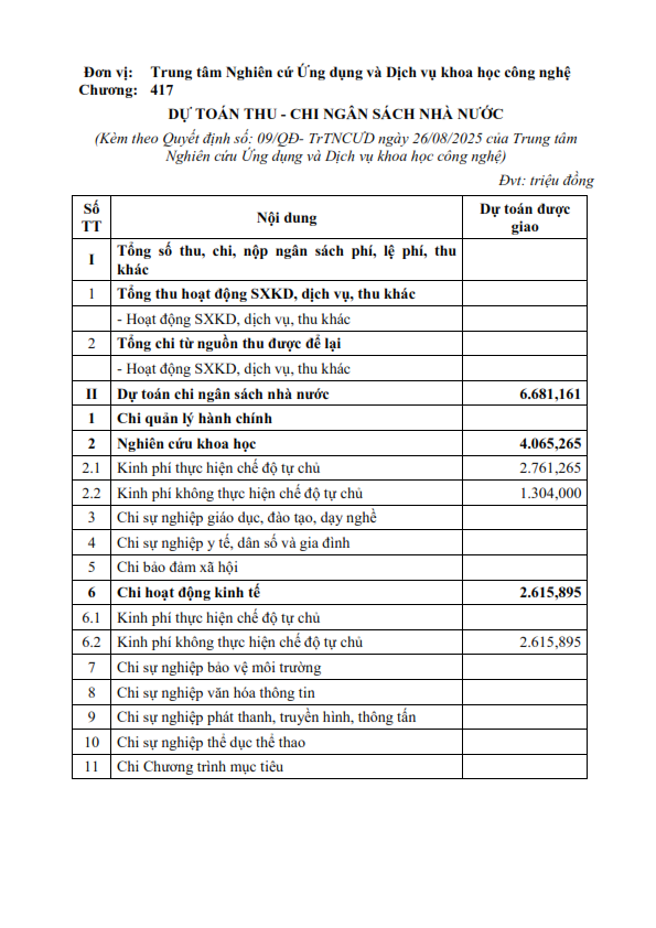 Trung tâm Nghiên cứu Ứng dụng và Dịch vụ khoa học công nghệ công bố công khai dự toán thu, chi ngân sách nhà nước năm 2025, cụ thể như sau: